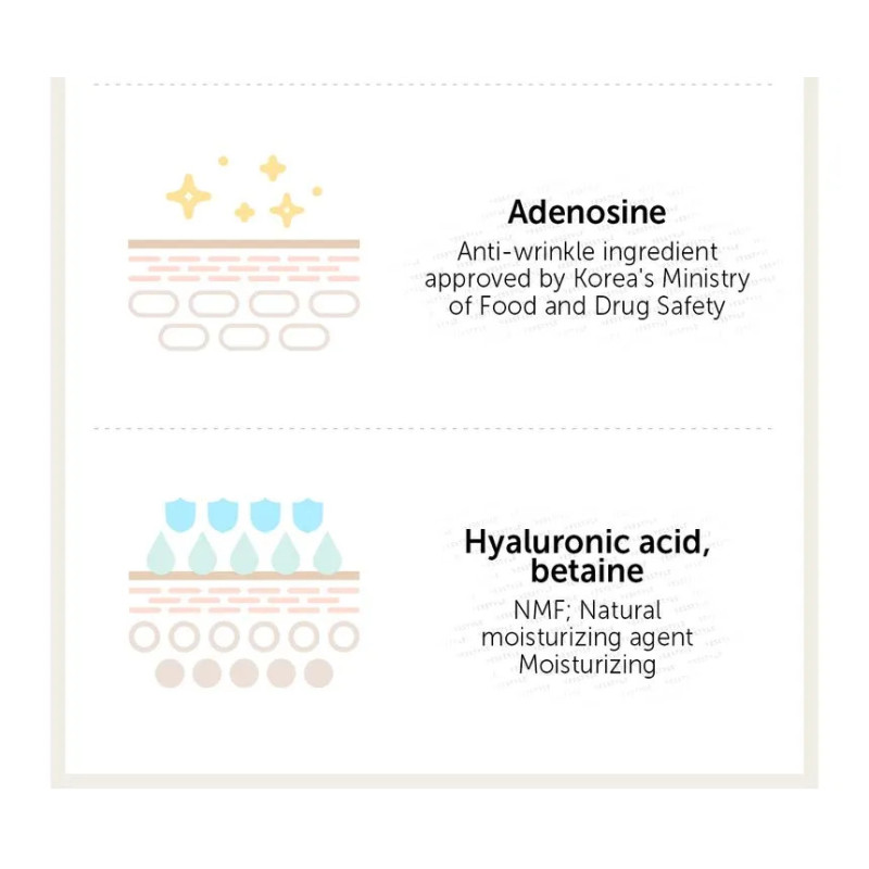 Il contient 84 % d’extrait de centella asiatica, de l’acide hyaluronique, de la bétaïne, ainsi que d’autres ingrédients illuminateurs et anti-âge, pour une peau rafraîchie, souple et rajeunie.