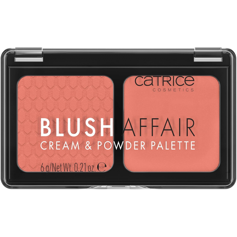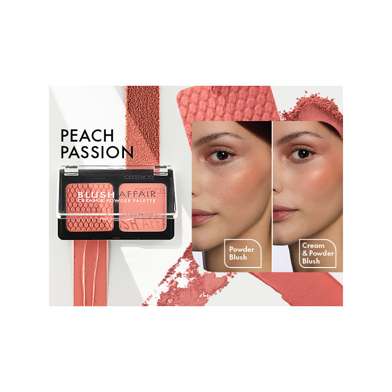 La palette Catrice Blush Affair Cream & Powder Palette 040 Peach Passion est un duo de blush crème et de blush poudre, hautement pigmenté, qui permet de superposer les textures pour un fini personnalisé. La teinte 040 est un pêche lumineux qui donne un effet bonne mine frais et naturel.