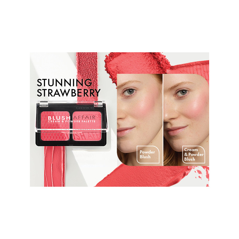 La palette CATRICE BLUSH AFFAIR Cream & Powder en teinte 010 Stunning Strawberry propose un blush crémeux et un blush poudre mat dans une nuance de rouge fraise. Les formules sont hautement pigmentées, modulables et faciles à estomper.