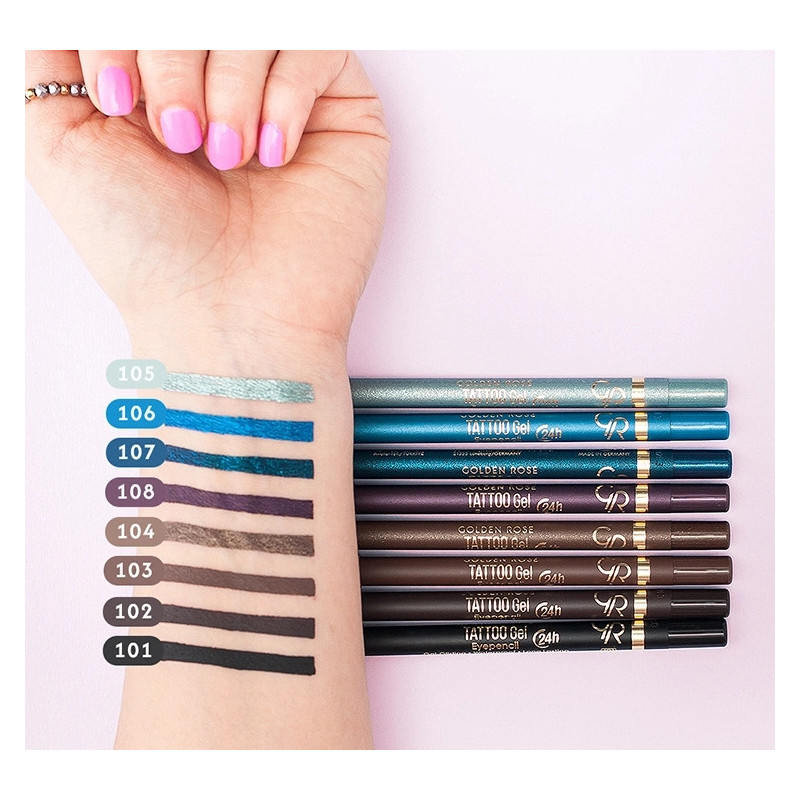 Le Golden Rose Tattoo Gel Eye Pencil est un crayon gel longue tenue, réputé pour sa texture douce et sa formule imperméable et résistante aux taches. Il est disponible en plusieurs teintes et offre une finition lisse et semi-mate.